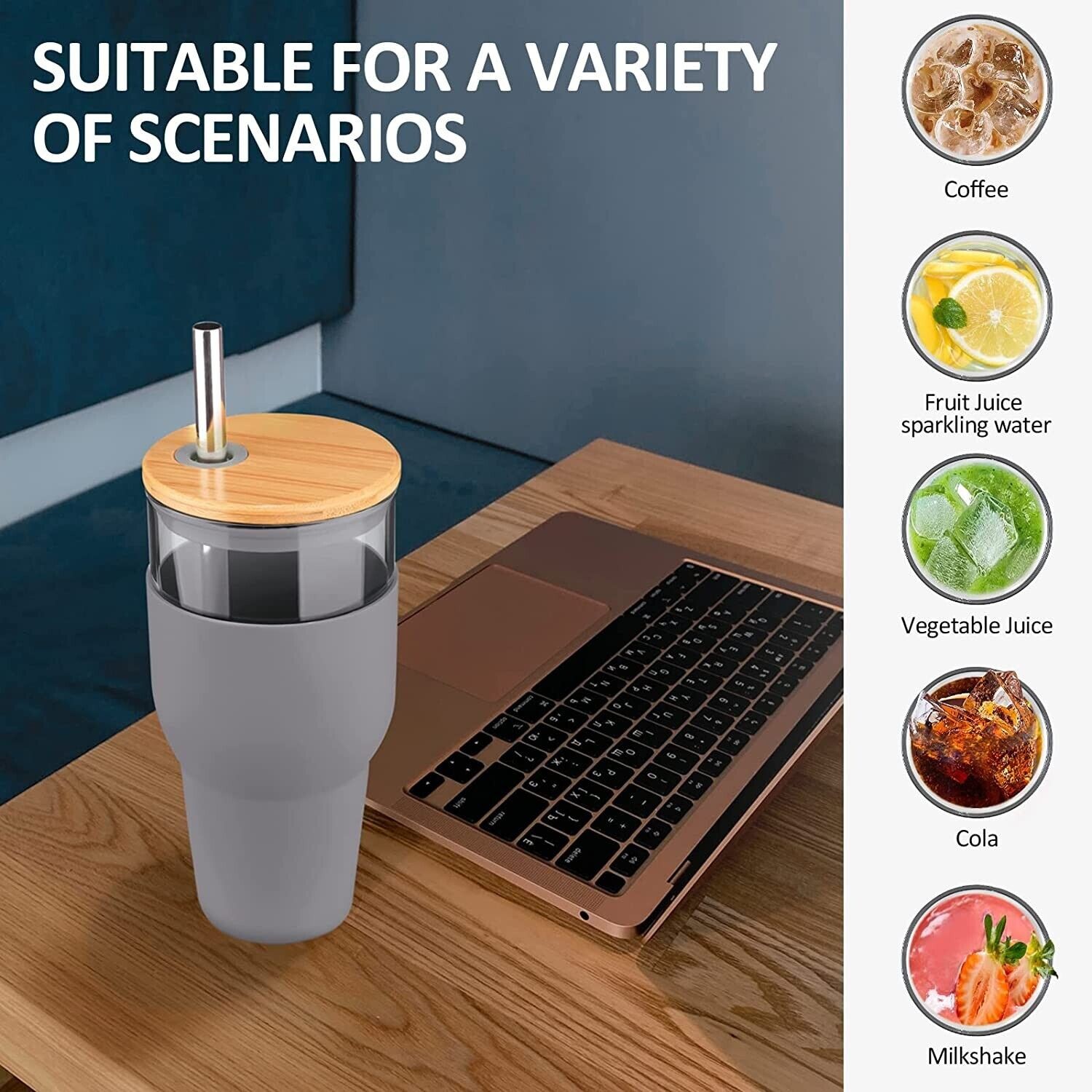 32oz Glass Tumbler with Straw and Lid, Reusable Boba Smoothie Cup (Gray)