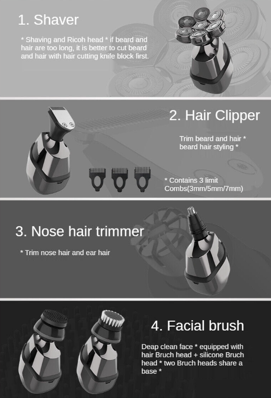 • ?【Multifunction Grooming Kit】Men's Multifunctional Electric Shaver includes six detachable accessories, including 7-head razor, hair clipper, nose trimmer, facial cleansing brush, body trimmer and hairbrush for different hair and beard styles. Meets all your shaving and facials needs.