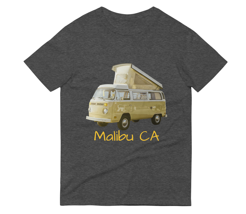 Show off your love for surfing and classic VW vans with this Malibu Pop Top T-Shirt. The black shirt features a cool graphic of a surfer and a vintage VW bus with a pop top roof. This unisex shirt is perfect for anyone who loves the beach, surfing, or retro style.