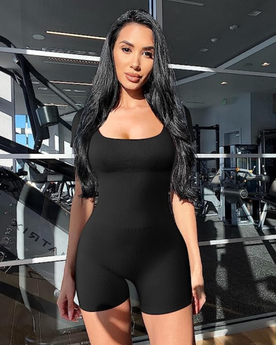 OQQ Women Yoga Rompers Workout Ribbed Short Sleeve Sport Romper