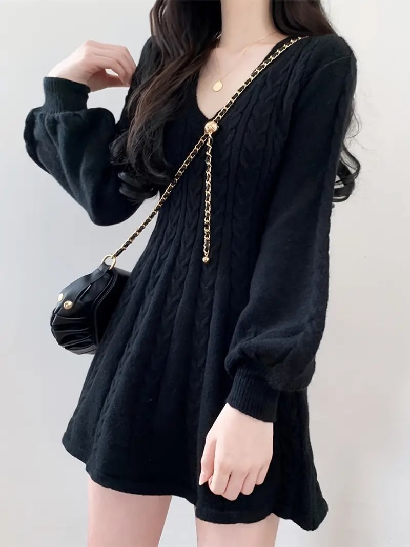 solid cable knit dress elegant v neck lantern long sleeve dress womens clothing details 1solid cable knit dress elegant v neck lantern long sleeve dress womens clothing details 1